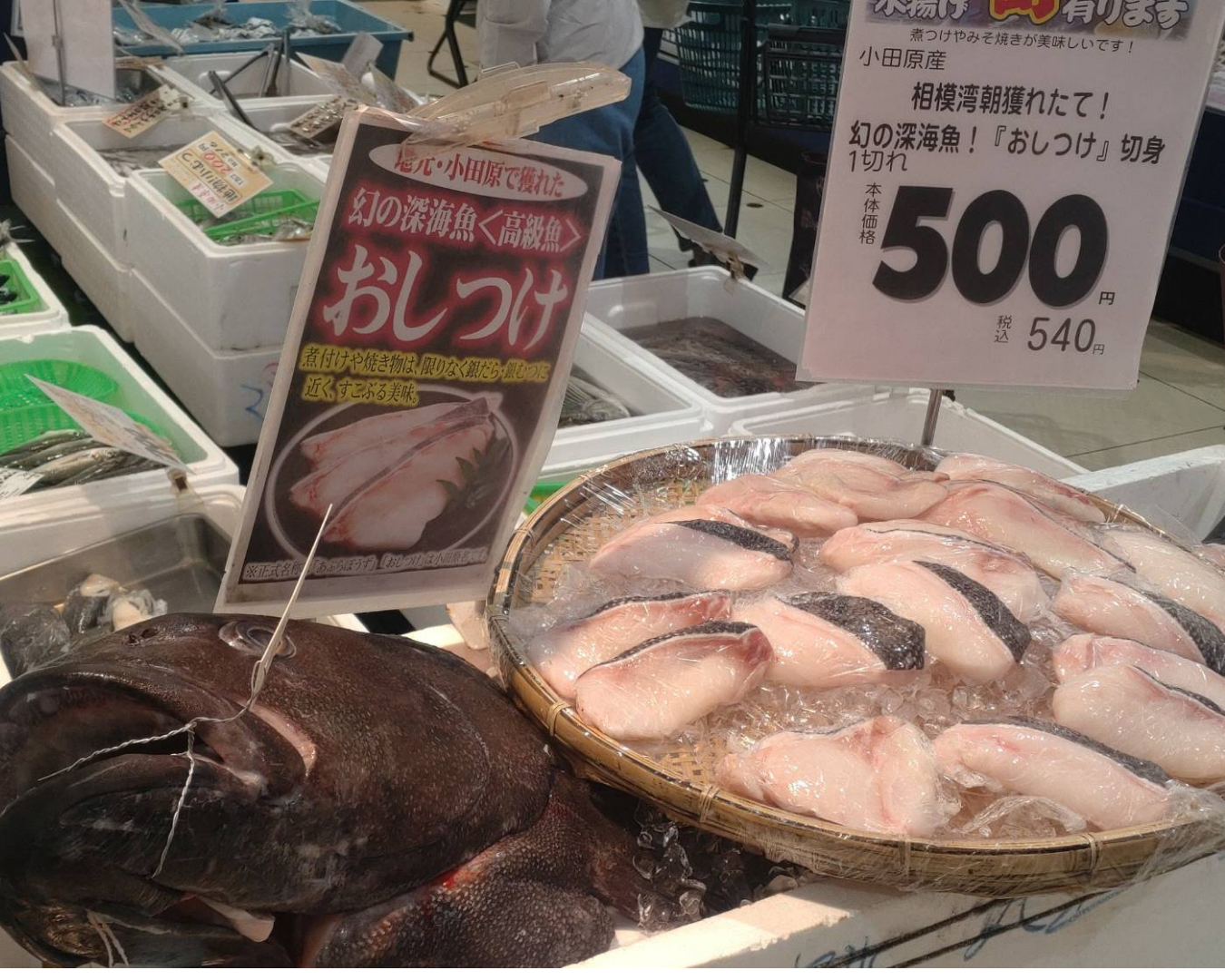 地元の魚「おしつけ(アブラボウズ)」がずらり。日常の買い物で旬の魚に出会えるのも小田原ならでは。