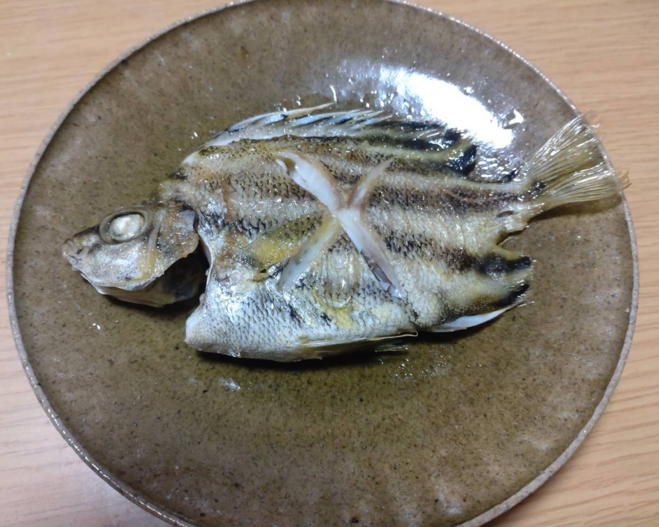桜井さんが作ったカゴカキダイの塩焼き。スーパーで見つけた魚が、食卓の主役に。
